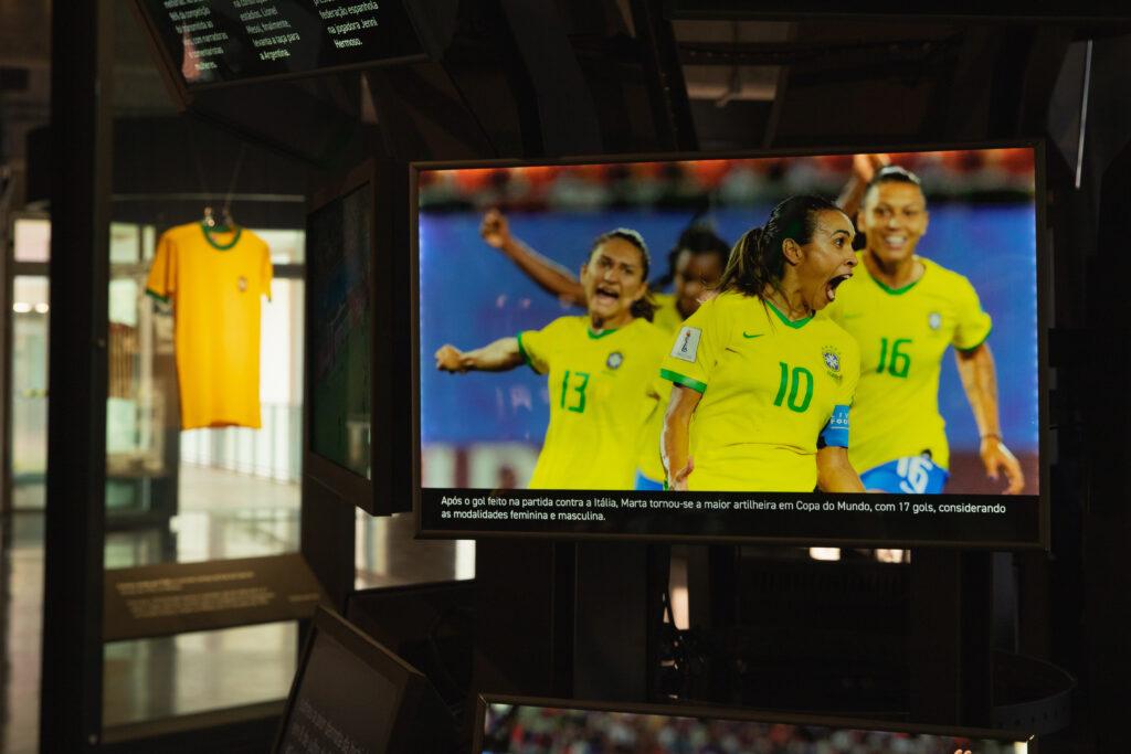 No mesmo pavilhão, a sensação é de mergulho e proximidade. Para se ter uma ideia, a seção “Rádios” permite ouvir a narração original de partidas em diferentes décadas. Jorge Cury (1950), Édson Leite (1958) e José Silvério (1977) são alguns dos comentaristas. Outra beleza é ver a representação acessível da jogadora Marta em campo, bem como nutrir-se de informações no jogo interativo “Dança do Futebol”.