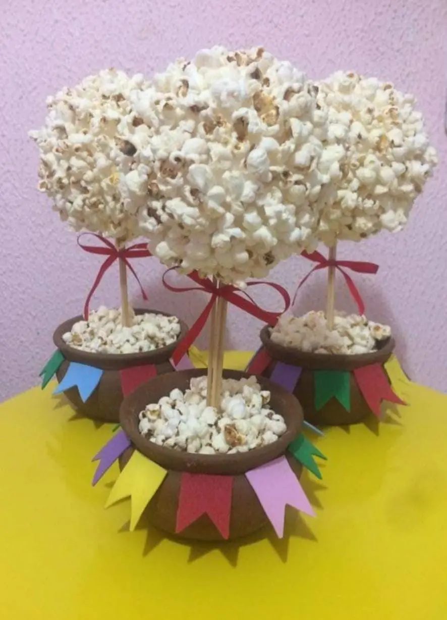 Para aniversários, por exemplo, um complemento que pode ser feito de forma artesanal são centros de mesa temáticos repletos de pipoca. Luana explica que, para a confecção, será preciso argila, jarrinho barro, palito de churrasco, uma bola de isopor, EVA colorido, fitinhas coloridas, pipoca e cola de isopor.