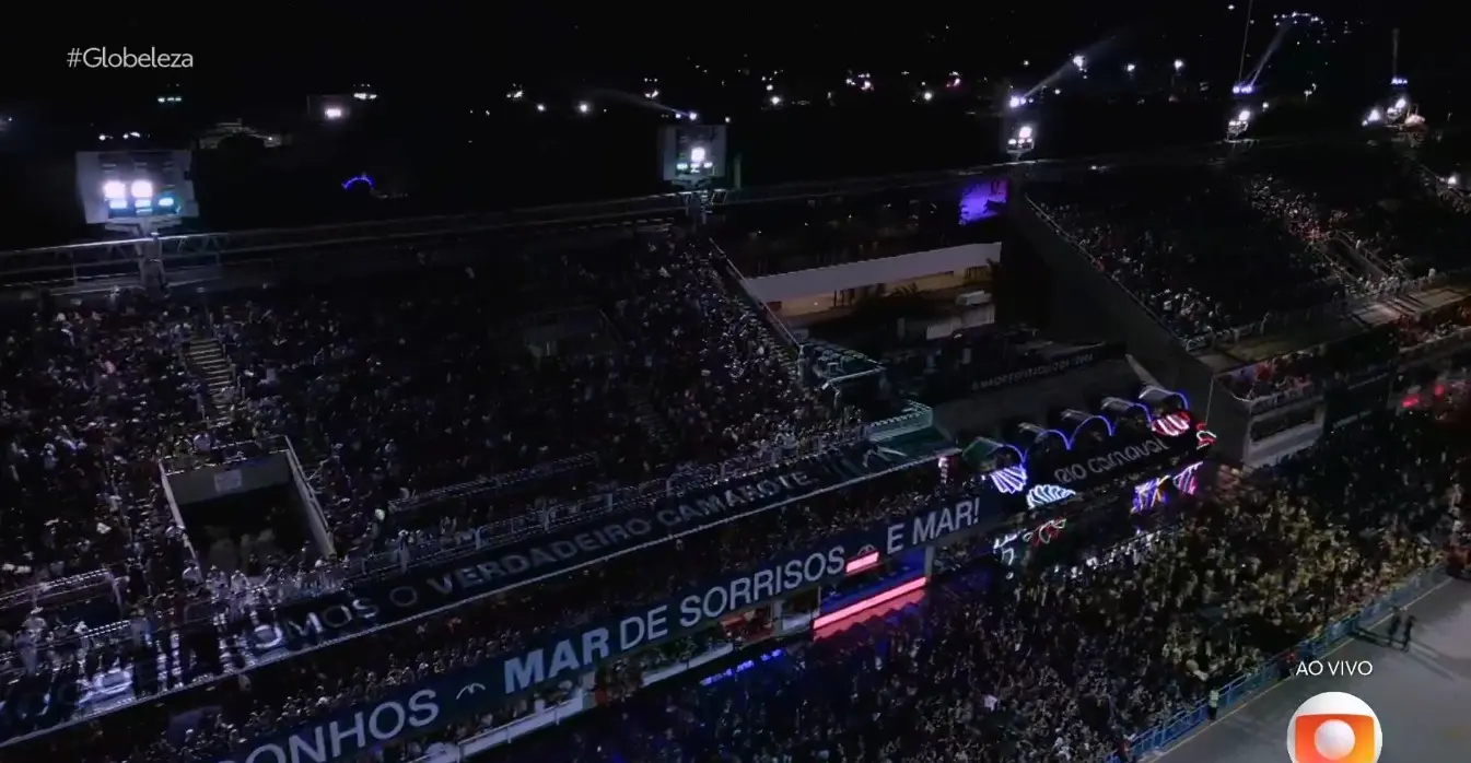 "Enquanto aguardamos o desfile da Viradouro, pedimos a breve atenção de todos para um comunicado da maior importância. Hoje é um dia muito especial para o nosso país. Além dos desfiles do Rio Carnaval, o cinema nacional vive um momento histórico com o filme 'Ainda estou aqui' concorrendo em 3 categorias no Oscar. E já temos o resultado", disse o locutor.