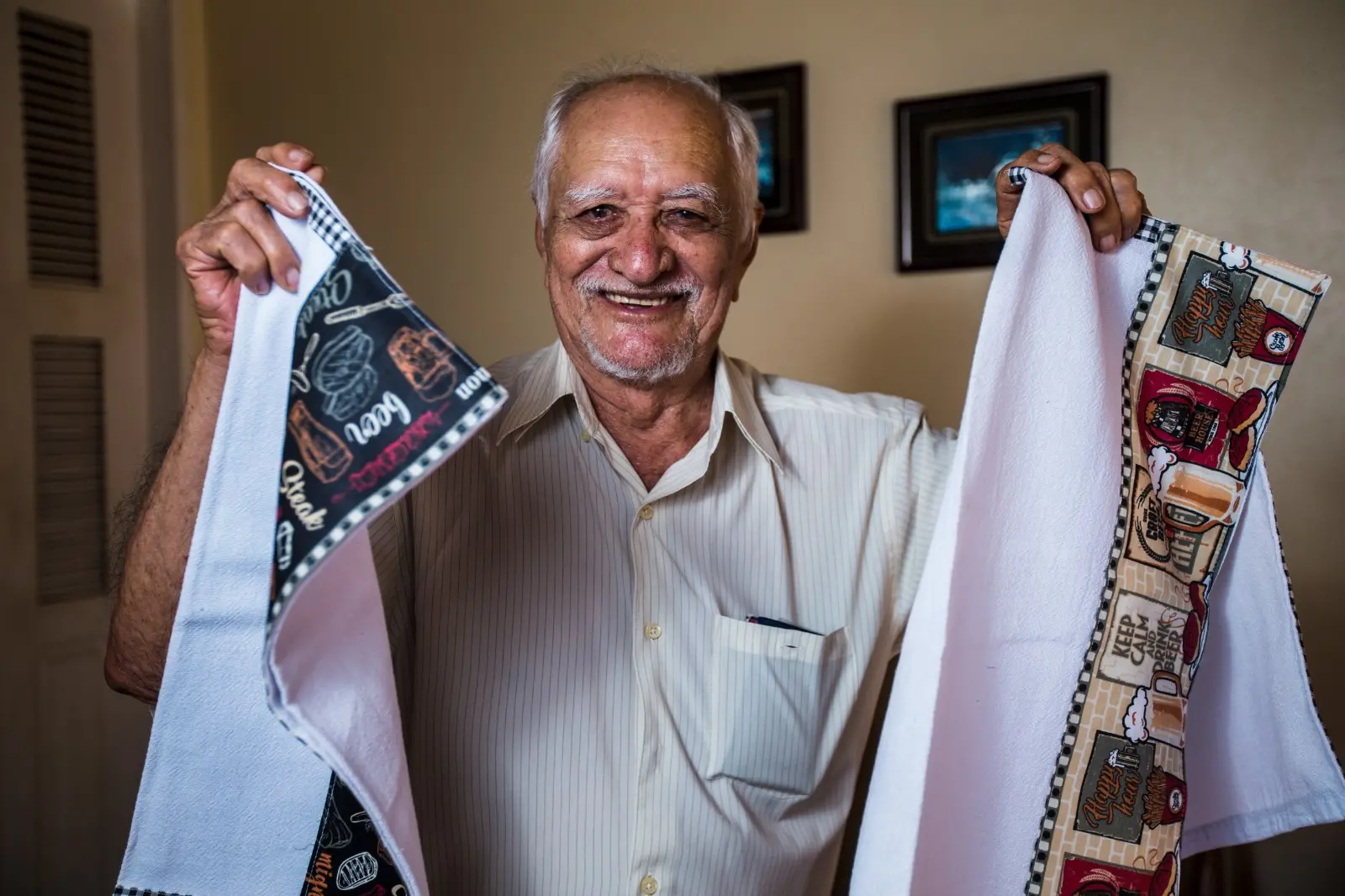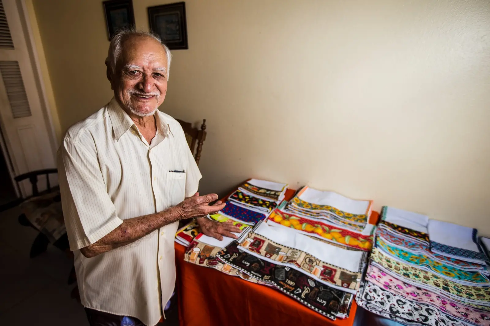 “A minha esposa fazia esses panos de prato por prazer e pra vender somente para a família. Eu olhava e dizia: ‘Isso pra mim não dá, não’. E ela: ‘Dá, meu filho’. Quando ela faleceu, eu ficava só chorando nos cantos, pensando no que iria fazer da minha vida. Aí Deus deu um toque no meu coração para eu acordar. Quando ouvi, foi uma voz dizendo assim: ‘Vá fazer os paninhos de prato que a sua esposa fazia’. Eu não sabia costurar. Hoje faço tudo”.