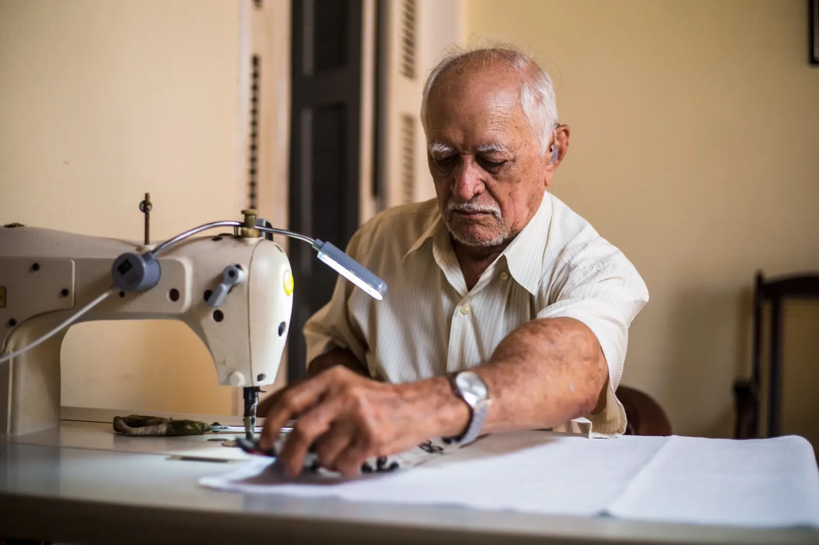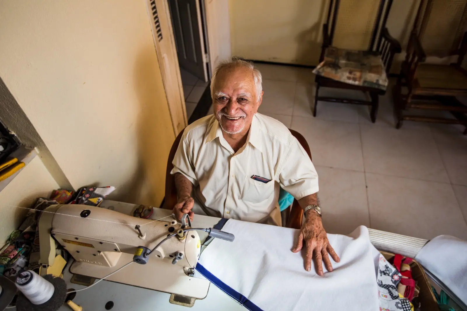 “Costuro de 20 a 25 panos de prato por dia. São 15 minutos para fazer um. É peia, viu? Não é brinquedo, não. Aos sábados, a gente leva para uma feirinha aqui do bairro, no condomínio do meu filho. Vendo muito bem”, festeja, sorriso aberto. “Uso o valor para pagar as despesas e, claro, lembrar da minha esposa. Fomos o maior amor do mundo”.