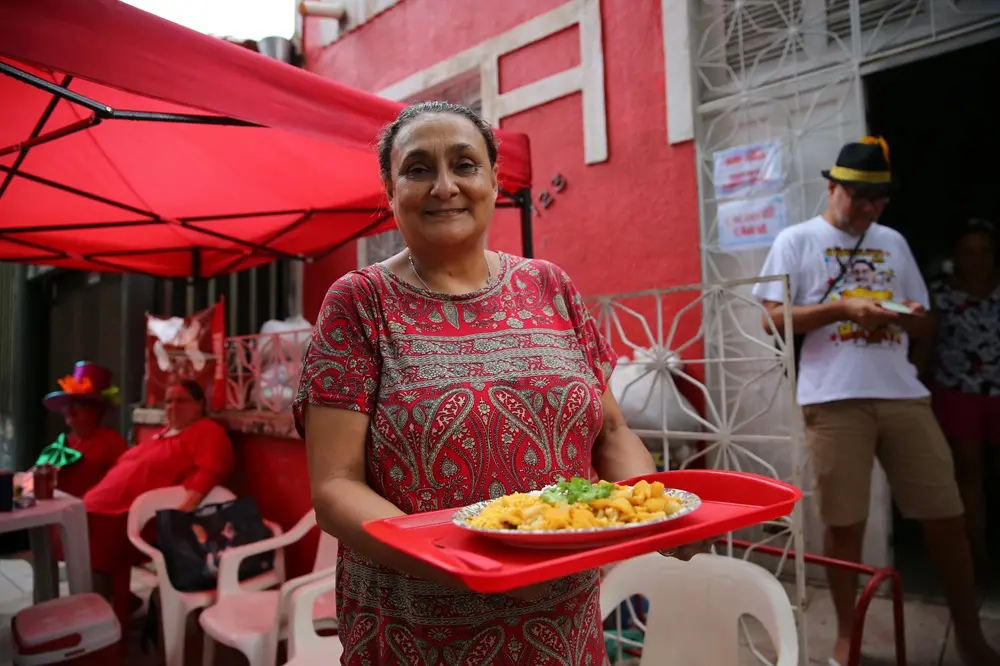 É a primeira vez que a anfitriã abre as portas do recinto para vender cerveja, caipirinha, tira-gosto e almoço. Começou no Pré-Carnaval e viu que foi tudo muito bom. “Agora a gente segue até terça-feira assim”, vibra, décadas de moradia no endereço. “Ou melhor: tá dando tão certo que tô pensando em fazer sempre, não só no Carnaval. Regularizar mesmo”.